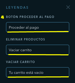 4. Modifica leyendas proceder al pago, vaciar carrito , tu carrito está vacío.